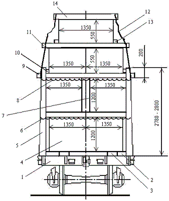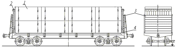 В полувагон с внутренней длиной кузова 12088 мм (рисунок 43) у торцовых дверей (стен) вагона укладывают друг на друга по 6-8 шпал 3 каждая на боковую сторону нижней пластью к пакетам. Вплотную к ним на пол вагона укладывают друг на друга три шпалы 4 типа I и (или) II нижней пластью вниз для установки щита. Вплотную к этим шпалам ставят пакеты нижнего яруса и щиты 2. На пакеты нижнего яруса устанавливают четыре пакета верхнего яруса.