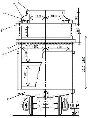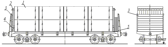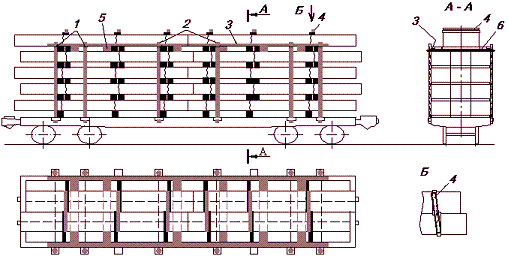 1 – полувагон; 2 – стойка; 3 – скрепление стоек; 4– удлиненная прокладка; 5 – увязка; 6 – распорная доска; 7 – прижимной брусок