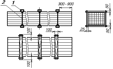 Нижней доской шпалы щита скрепляют со стороны пакетов. Верхние доски скрепляют между собой увязками 3, пропущенными между шпалами. Увязка состоит из проволоки диаметром не менее 4 мм в один оборот, с закруткой ее концов в три витка.