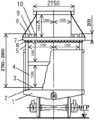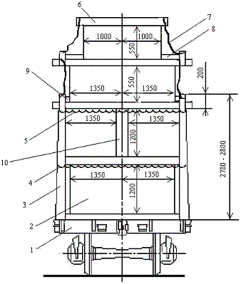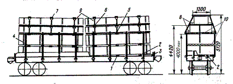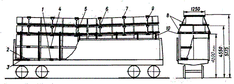 1 – полувагон; 2 – утолщенная подкладка; 3 – торцовый упор; 4 – пакет прямоугольной части штабеля; 5 – стойка; 6 – скрепление стоек; 7 – удлиненная прокладка; 8 – увязка пакет «шапки»; 9 – распорная доска; 10 – упорный брусок