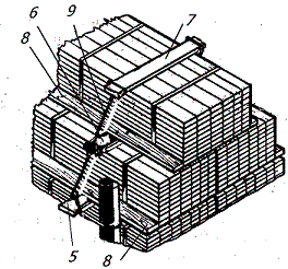 На удлиненные прокладки 5 с обеих сторон пакетов укладывают упорные доски 8 толщиной не менее 50 мм и такой ширины, чтобы они одной стороной упирались в боковые стойки, а другой – в пакеты. Длина распорных досок должна быть равна длине пакета. На удлиненные прокладки 6 вплотную к пакету укладывают аналогичные упорные доски шириной от 100 до 150 мм.