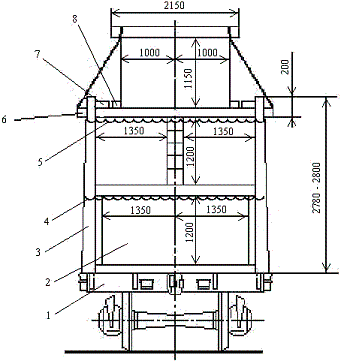 1 – платформа; 2 – пакет прямоугольной части штабеля; 3 – стойка; 4 – среднее скрепление стоек; 5 – верхнее скрепление стоек; 6 – удлиненная прокладка; 7 – распорная доска; 8 – упорный брусок