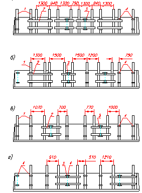 а – шесть штабелей; б – пять продольных штабелей и один поперечный штабель; в – пять штабелей; г – четыре штабеля