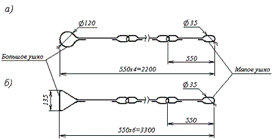 На удлиненных прокладках, на расстоянии не менее 50 мм от их торцов, должны быть выполнены зарубки глубиной от 10 до 15 мм. Увязку лесоматериалов в «шапке» выполняют с использованием многооборотных шестизвенных стяжек (рисунок 2) следующим образом. Большое ушко стяжки заводят на зарубки удлиненной прокладки и фиксируют на ней двумя гвоздями длиной от 70 до 80 мм включительно либо проволокой диаметром не менее 3 мм. Малое ушко закрепляют к другому концу прокладки стяжкой из проволоки диаметром 6 мм в две нити, при этом должны быть выполнены два оборота проволоки вокруг прокладки.