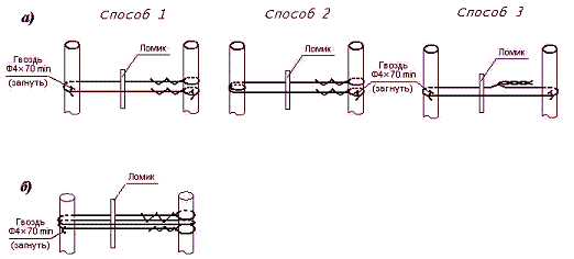 Большое ушко стяжки надевают на стойку и фиксируют его от смещения вдоль стойки двумя гвоздями длиной от 70 до 80 мм включительно, малое ушко крепят к противоположной стойке стяжкой из проволоки диаметром не менее 5 мм в четыре нити. Проволочную стяжку скручивают ломиком усилием одной руки (25 кгс) на плече 500 мм.