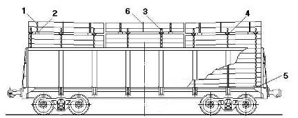Тонкомерные круглые лесоматериалы (подтоварник) объединяют в щиты 3, 7 с помощью увязок 5 из проволоки диаметром 6 мм в одну нить. Торцовые щиты дополнительно укрепляют двумя досками или горбылями толщиной не менее 25 мм, шириной не менее 100 мм и длиной, равной ширине щита. Длина торцового щита должна быть равна внутренней ширине полувагона. Боковое ограждение должно состоять из двух щитов либо трех щитов встык. При установке боковые щиты упираются в торцовые щиты. Каждый щит закрепляют в четырех местах к стойкам увязками из проволоки диаметром не менее 3 мм в одну нить. В местах верхнего крепления щита к стойке на ней выполняют зарубку для фиксации в ней проволоки. Противоположные боковые стойки должны быть скреплены в соответствии с требованиями пункта 1.5 настоящей главы.