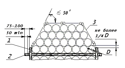 2.1.3 Формирование прямоугольной части штабеля производят до уровня ниже верхнего обреза стоек на величину средней толщины круглых лесоматериалов в штабеле.