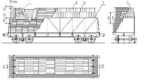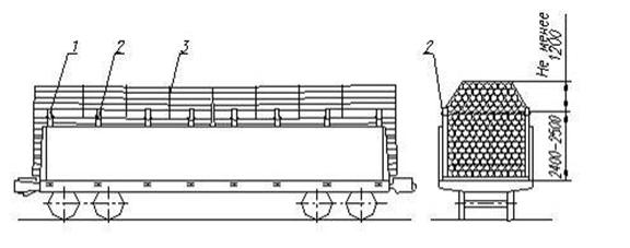 Перед установкой первого ограждения лесоматериалы размещают штабелями вдоль полувагона до высоты на 0,6 м ниже уровня верхней обвязки вагона. Затем на размещенные горизонтально круглые лесоматериалы устанавливают по периметру полувагона вплотную к стенам и дверям сплошной ряд 3 из круглых лесоматериалов одинаковой толщины. При этом лесоматериалы, используемые в качестве ограждения не должны превышать верхней обвязки полувагона более чем на 400 мм. После установки первого ряда ограждения, размещаемые в полувагоне круглые лесоматериалы укладывают горизонтально вплотную в пределах ограждения высотой 400 мм. Затем на размещенные горизонтально круглые лесоматериалы вплотную к первому ряду ограждения устанавливают второй сплошной вертикальный ряд 2 ограждения, который должен возвышаться над первым не более чем на 400 мм. После установки второго ряда ограждения размещаемые в полувагоне круглые лесоматериалы укладывают горизонтально вплотную по высоте ниже верхнего уровня второго ряда ограждения не менее, чем на 50 мм.