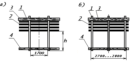 1 – стойка; 2 – скрепляющая доска; 3 – проволочная увязка; 4- лесная скоба