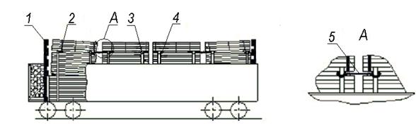 1 – торцовый щит; 2 – удлиненная прокладка; 3 – стойка; 4 – скрепление стоек; 5 – увязка удлиненных прокладок