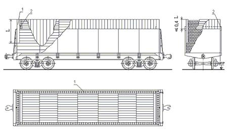 Высота ограждения от уровня боковых стен полувагона должна быть не более 0,4 длины круглых лесоматериалов. Ограждение устанавливают после размещения лесоматериалов до высоты от уровня пола полувагона не более 0,4 L. Круглые лесоматериалы 1 ограждения дверей скрепляют друг с другом доской (горбылем) 2 толщиной не менее 30 мм и длиной от 2,9 до 3,0 м включительно. Доску (горбыль) укладывают с внутренней стороны ограждения с опорой на верхнюю обвязку полувагона и закрепляют к двум крайним и двум средним круглым лесоматериалам гвоздями длиной не менее 70 мм. Лесоматериалы укладывают горизонтально до уровня ниже верхнего уровня ограждения не менее чем на 50 мм. Зазор между торцовым ограждением и погруженными лесоматериалами заполняют круглыми лесоматериалами, располагаемыми горизонтально до уровня ниже верхней обвязки полувагона на величину от 100 до 150 мм.