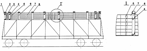 1 – торцовые стойки; 2 – крепление щита к стойкам; 3 – торцовые щиты; 4 – крепление бокового щита к боковым стойкам; 5 – увязка щита; 6 – боковые стойки; 7 – боковые щиты; 8 – верхнее поперечное скрепление стоек.