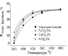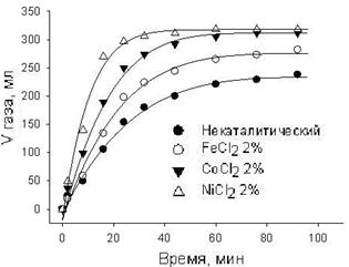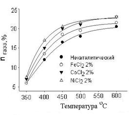 В случае использования катализаторов существенное снижение массы твердого остатка и увеличение массы газообразных и жидких продуктов наблюдалось в интервале ºС, при дальнейшем увеличении температуры процесса массовое распределение продуктов изменялось незначительно, в отличии от некаталитического процесса при котором массовое распределение продуктов изменялось на протяжении всего исследованного интервала температур. При использовании всех исследуемых хлоридов металлов подгруппы железа в качестве катализаторов процесса пиролиза наблюдалось увеличение скорости образования и объема газообразных продуктов, причем по степени влияния хлоридов металлов подгруппы железа данные характеристики исследуемые соли соответствуют ряду: