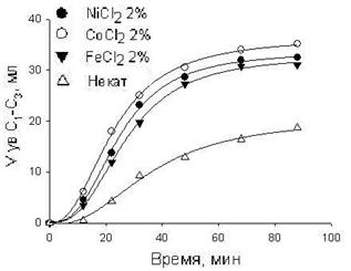 Следует отметить, что при дальнейшем увеличении концентрации катализатора происходит увеличение объема газообразных продуктов пиролиза. При этом не наблюдалось увеличение массы пиролизного газа. Данный факт объясняется увеличением объемов низкомолекулярных продуктов, в большей степени водорода. Следовательно, это приводит к снижению значения удельной теплоты сгорания газообразной смеси. Поэтому использование исследуемых хлоридов металлов с массовым содержанием свыше 2% экономически не выгодно. Большая часть газообразных продуктов образовывалась в течение первых 25 минут от начала эксперимента. В зависимости от вида используемого катализатора объем образующихся газообразных продуктов каталитического пиролиза полимерного корда возрастает на 15 – 45 % по сравнению с некаталитическим процессом (см. рис. 5.)