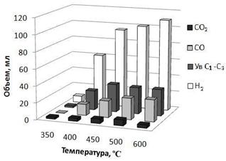 Рисунок 4 – Зависимость массовой доли газообразных продуктов пиролиза от температуры процесса пиролиза |