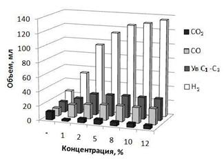 При использовании хлоридов металлов подгруппы железа наблюдалось увеличение образования объемов углеводородов С1 - С3 в 1,65 – 1,9 раз, причем наибольшее количество было получено в присутствии хлорида кобальта. Увеличение концентрации низших углеводородов, таких как метан, этан, этилен, пропан в составе газообразных продуктов пиролиза в присутствии хлоридов металлов подгруппы железа может быть связано с влиянием апротонных кислотных центров хлоридов металлов подгруппы железа, что согласуется с литературными данными. Увеличение концентрации хлоридов металлов подгруппы железа в субстрате свыше 2% (масс.) не оказывает значительного влияния на изменение массового распределения продуктов пиролиза. Поэтому концентрация катализатора в субстрате 2% (масс.) является достаточной для получения высокого выхода жидких и газообразных продуктов. В присутствие ионных соединений, каковыми являются хлориды металлов подгруппы железа, процесс пиролиза может изменять свой механизм с радикально-цепного на ионный, также являющийся цепным. Использование катализаторов приводило к росту углеводородной составляющей С1-С3, оксида углерода (II) и водорода (см. рис. 7, 9), что приводило к увеличению общей теплоты сгорания газообразных продуктов пиролиза. Общая теплота сгорания газообразных продуктов пиролиза при использовании хлорида железа, кобальта и никеля увеличивалась соответственно в 1,7; 2,0; 1,8 раза по сравнению с некаталитическим процессом. Увеличение температуры процесса свыше 450 ºС и концентрации катализатора более 2% (масс.) не приводило к возрастанию общей теплоты сгорания полученной газообразной смеси. Это может быть объяснено тем, что значения объемов образующихся горючих газов (углеводороды С1-С3, оксида углерода (II) и водорода) остаются практически