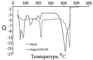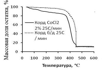 Для образцов исходного полимерного корда и корда с добавлением хлорида кобальта проведено исследование с помощью методов термогравиметрии и дифференциальной сканирующей калориметрии.
