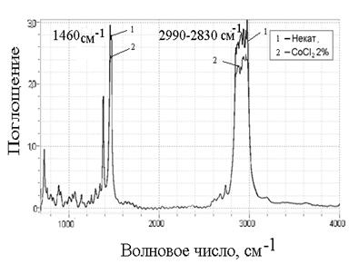 Рисунок 13 – Обзорный ИК-спектр жидких продуктов пиролиза для некаталитического процесса и процесса с добавлением CoCl2 2% T=450 °C |