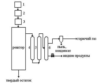 Рисунок 16 – Общая схема пиролиза полимерного корда в присутствии хлорида кобальта: 1 – смеситель корда и катализатора; 2 – гранулятор; 3 – сушилка; 4,5 – холодильники; 6-сепаратор |