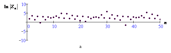(рис. 3а) наблюдается нерегулярный характер процесса, что говорит об отсутствии сходимости. (Для наглядности на рис. 3 выбран логарифмический масштаб вдоль оси ординат.)