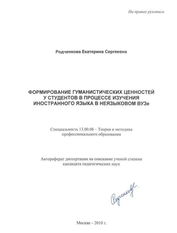 10. Родченкова иностранного языка при формировании гуманистических ценностей у студентов в неязыковых вузах [Текст] / // Studia Neoterica: сборник научных статей аспирантов – М.: МГПИ, - 2009. – С. 146-150. – (0,31 п. л.).