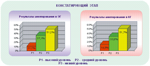 На констатирующем этапе эксперимента, посредством бесед и авторского анкетирования, проведенных в ЭГ и КГ, было установлено, что студенты этих групп имеют довольно поверхностные представления о ценностях, их главной приоритетной идеей стало материальное богатство, всемирное признание, деньги, а такие понятия, как человек, семья, жизнь, традиции, культура, гармония, красота и т. д. уходят на последний план. Так, на начало эксперимента в ЭГ 51,2% респондентов проявили низкий уровень сформирванности гуманистических ценностей, и 51,7 % – в КГ (см. табл.1).
