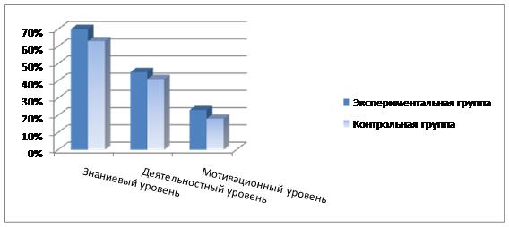На этапе констатирующего эксперимента результаты показали, что по указанным показателям уровень компетенции экспериментальной и контрольной групп почти равен: знаниевый уровень наблюдался у 70% участников экспериментальной и 63% участников контрольной групп, деятельностный уровень отмечен у 45% участников экспериментальной и 41% участников контрольной групп, мотивационный уровень – у 23% и 18% соответственно.