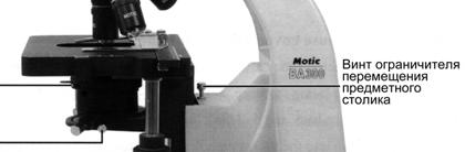 - Ограничитель перемещения фиксирует положение предметного столика, когда изображение наблюдаемого объекта отфокусировано, т. е. ограничивает движение механизма грубой фокусировки. Добившись четкого изображения наблюдаемого объекта, вращайте винт ограничителя перемещения против часовой стрелки до упора. Предметный столик после установки винта ограничителя нельзя переместить вверх. Это позволяет избежать повреждения препарата и фронтальных линз объективов с большим увеличением (40х и 100х).