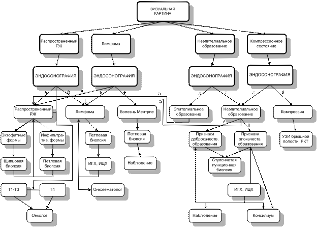 Рис.9. Алгоритм комплексной эндоскопической диагностики распространенного рака, лимфом, неэпителиальных новообразований и компрессионных состояний стенки желудка: