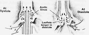 1. Расширение корня аорты вторично по отношению к аневризме восходящей аорты: механизм аортальной недостаточности связан с расширением синотубулярной зоны и расхождением комиссур и неполной центральной коаптацией лепестков аортального клапана. Такая недостаточность протекает более остро при первичной дилятации фиброзного кольца, но чаще она бывает вторичной.
