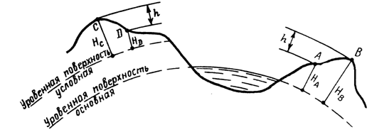 При проведении практических съемок часто оказывается целесообразным определять отметки не относительно основной, а относительно условно принятой уровенной поверхности. Тогда отметки в первом случае называются абсолютными, во втором – условными (HA, НВ – абсолютные отметки; HD, НC – условные).