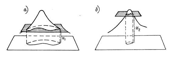Пусть имеется некоторая возвышенность (рис. 20, а), которую пересекает поверхность, параллельная уровенной и расположенная от нее на высоте H1. Линия пересечения физической поверхности Земли будет замкнутой кривой и, будучи спроектированной на горизонтальную плоскость, эта линия, называемая горизонталью, характеризует данную возвышенность на отметке H1.