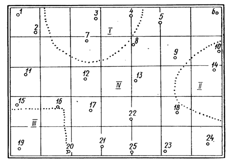 В верхней половине листа формата А4, на котором выполняется задание, вычертите прямоугольник размером 100 ´ 140 мм с сеткой квадратов 20 ´ 20 мм. В квадраты сетки на глаз с рис. 32 перенесите точки и вместо их номеров из табл. 2 выпишите отметки, согласно варианту, указанному преподавателем.