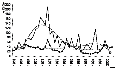 Рис. 1. Заболеваемость дизентерией Флекснера (¾·¾) и Зоне (¾¾)