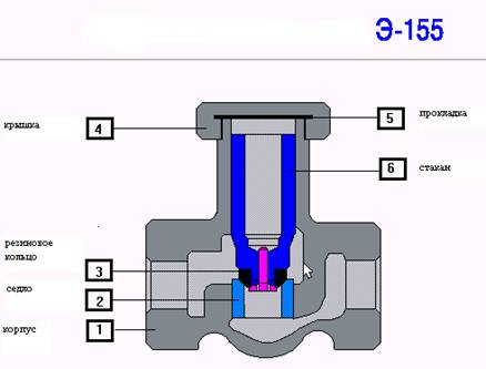 · Корпус с горловиной, входным и выходным штуцерами, а также седлом для стакана, которое может быть выполнено из стали для Э-155 или латуни для Э-175. Седло изнутри запрессовано в корпус.