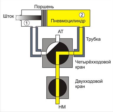 Управление пневмоцилиндром по выдвиганию или задвиганию электрических пальцев (штепсельных разъемов) в ЭКК производится при помощи четырехходового крана, приводимого в действие реверсивной рукояткой, которая вставляется для этого в наконечник, находящейся на квадратном хвостовике пробки крана. Видно, что при таком положении пробки четырехходового крана воздух из НМ проходит в полость 2 пневмоцилиндра, а полость 1 пневмоцилиндра сообщается с атмосферой. При этом в данный момент электрические пальцы выдвинуты. Если пробку четырехходового крана повернуть на 900 по часовой стрелке, то уже полость 1 пневмоцилиндра будет сообщаться с НМ, а полость 2 — с атмосферой, и электрические пальцы в ЭКК уберутся.