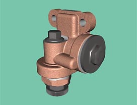· Латунный тарельчатый клапан (ступенчатой формы) с направляющей крестовиной (перьями). Снизу у клапана имеются две поверхности, на которые действует сжатый воздух напорной магистрали ― рабочая "А", на которую сжатый воздух воздействует всегда при нормально работающем мотор-компрессоре, и срывная "В", на которую сжатый воздух напорной магистрали будет воздействовать снизу при поднятии тарельчатого клапана со своего седла. Площадь срывной больше площади рабочей.