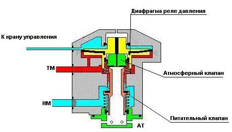 - Магистральная диафрагма (МД). Установлена внутри корпуса главной части ВР. МД имеет нагрузочную пружину сверху. Диафрагма, для исключения разрывов, установлена между двух металлических дисков, в центре которых расположен зажим. Зажим имеет внутреннюю полость. В верхней части зажима высверлено наклонное, калиброванное отверстие d = 0,8 mm. Так же в верхней части зажима расположен захват для крепления стержня с манжетами. Благодаря реакции МД на разницу давления в рабочей и магистральной камерах, зарождаются процессы торможения и отпуска тормоза.