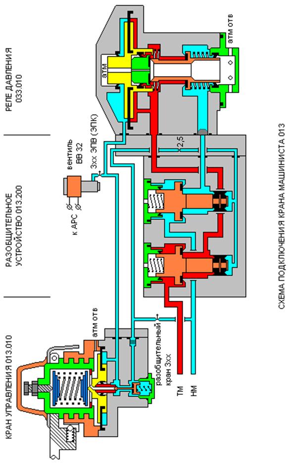 НМ – трубопровод напорной магистрали. Проходит по камерной части к ВЗ №1 и, при его включенном положении, заканчивается в камере под поршеньком. Одновременно трубопровод НМ подходит к питательной камере (камере над питательным клапаном). Именно на трубопроводе НМ расположен 3-х ходовой разобщительный кран ВР. ТМ – трубопровод тормозной магистрали. Проходит по камерной части через фильтр тонкой очистки и ВЗ №2 заканчиваясь в магистральной камере (камере над магистральной диафрагмой). Одновременно трубопровод ТМ подходит к стержню с тремя манжетами. На трубопроводе ТМ расположен 2-х ходовой разобщительный кран ТМ. ТЦ – трубопровод тормозных цилиндров, ведущий из-под питательного клапана в тормозные цилиндры через 3-х ходовой разобщительный кран ТЦ. Трубопровод, в верхней части, имеет боковой канал диаметром 4 мм., ведущий в тормозную камеру (камеру над режимной диафрагмой). ОТЦ – обратная трубка цилиндров. Трубопровод, сообщающий тормозную камеру, через 2-х ходовой разобщительный кран ОТЦ с тормозными цилиндрами. ОТЦ фактически дублирует боковой канал, ведущий из трубопровода ТЦ в тормозную камеру. Это предусмотрено для того, чтобы в случае засорения бокового канала, исключить превышение давления в тормозных цилиндрах свыше установленных норм, а так же для более эффективного наполнения тормозных цилиндров из тормозной камеры и исключения дросселирования питательного клапана ВР. АР – трубопровод, сообщающий авторежимную камеру (камеру под режимной диафрагмой) с камерой под диафрагмой пневмореле авторежима.