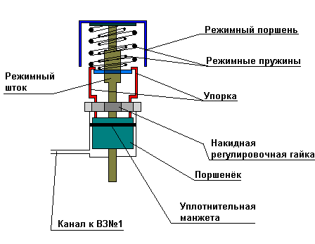 - Большой поршень (режимный поршень). Имеет уплотнительную манжету. Надет на режимные пружины сверху. Через поршень и режимные пружины, режимный шток воздействует на режимную диафрагму снизу.