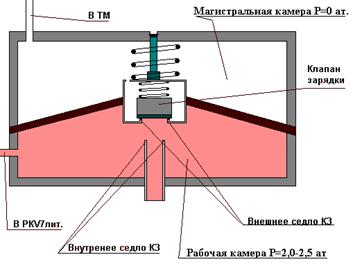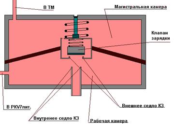 Камера под диафрагмой пневмореле.По каналу АР, через 3-х ходовой разобщительный кран АР, сообщается с авторежимной камерой главной части ВР, а так же с камерой под обратным клапаном пневмореле.