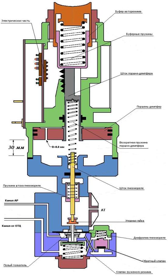 На шток пневмореле, сверху упирается возвратная пружина поршня-демпфера. Так же шток имеет свою возвратную пружину и упорную регулировочную гайку, которой он воздействует на диафрагму пневмореле сверху. На гайке снизу, сделана поперечная проточка, для сообщения через нее, полого толкателя пневмореле с атмосферой.
