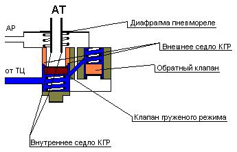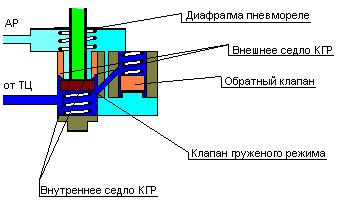 - клапан груженого режима пневмореле (КГР) Имеет 2 седла. Внутренним седлом является нижний торец полого толкателя диафрагмы пневмореле. Внешнее седло выполнено в корпусе пневмореле.