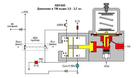 Как известно пневматический тормоз обладает так называемым «свойством мягкости», т. е. при утечке сжатого воздуха из тормозной магистрали темпом мягкости (0,3 – 0,5 ат/мин.), воздухораспределитель не осуществляет пневматического торможения. Это происходит потому, что при падении давления в магистральной камере в главной части ВР, одновременно давление падает в рабочей камере главной части ВР и в рабочей камере объемом 7 литров, так как воздух из них успевает свободно проходить через открытое, внешнее седло клапана зарядки и калиброванное отверстие d=0,8 мм. в верхней части зажима магистральной диафрагмы не вызывая разницы давления в рабочей и магистральных камерах главной части ВР. Так как такие утечки, при не своевременном обнаружении их машинистом весьма опасны, для контроля за подобными ситуациями, был разработан прибор безопасности АВУ-045. АВУ-045 предназначен для контроля за давлением в тормозной магистрали. При падении давления в тормозной магистрали ниже отметки в 2,7 – 2,9 ат., АВУ-045 размыкает свой контакт в цепи катушки Р1-5 (цепь управления) и включает ВЗ№1 на всех вагонах состава. АВУ-045 по конструкции относится к клапанно-диафрагменно-поршневым, электропневматическим приборам. АВУ-045 условно можно разделить на две части – пневматическую и электрическую (контактную). АВУ-045 установлен в кабине машиниста, перед УАВА. У машиниста, в предусмотренных случаях, есть возможность отключить АВУ-045 при помощи тумблера, который расположен на пульте и опломбирован.