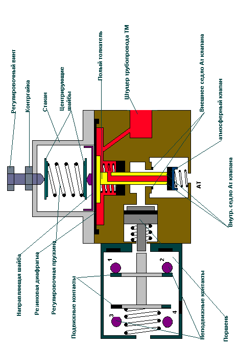- полый толкатель. Установлен под резиновой диафрагмой. Толкатель имеет возвратную пружину снизу. Канал толкателя сообщается с камерой под диафрагмой (а следовательно и с тормозной магистралью) через два отверстия в верхней его части. Нижний торец полого толкателя, является внутренним, подвижным седлом атмосферного клапана.