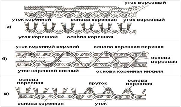 Рис. 1.19. Разрез ткани ворсовых переплетений: а) - уточноворсовое переплетение; б) - основоворсовое переплетение, двухполотенный способ; в) - основоворсовое переплетение, прутковый способ