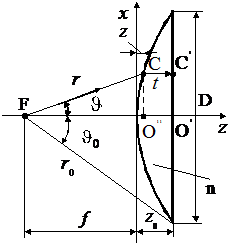 Рис. 1.10 | Форма профиля должна быть такой, чтобы падающая на линзу сферическая волна внутри линзы превращалась в плоскую. Из условия равенства оптических длин путей луча, падающего на линзу в точку С, и луча, проходящего вдоль оси z до точки О¢, имеем: