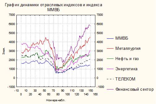В ходе исследования была рассмотрена динамика показателей индекса ММВБ и входящих в него отраслевых индексов (металлургия, нефтегазовый сектор, финансовый сектор, сектор энергетик и сектор телекоммуникаций). На рисунке 1 показан график, построенный на данных временного интервалы с 5 мая 2007 по 29 марта 2010 года (недельные данные)[1].
