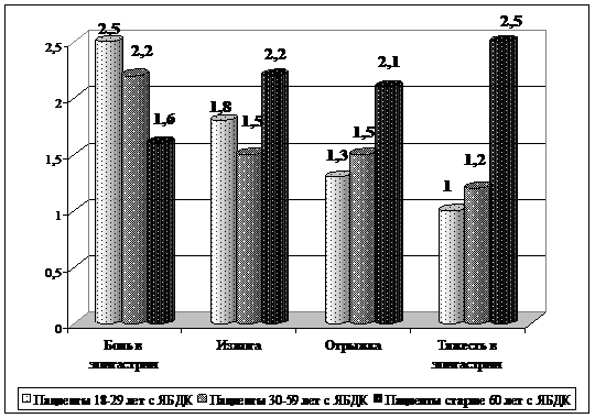 Рис. 2. Сравнительный анализ симптомов в баллах у пациентов различного возраста с ЯБЖ (* – показатели имеют достоверные различия со значениями у пациентов с ЯБЖ в возрасте 18-29 лет, р<0,05; © – показатели имеют достоверные различия со значениями у пациентов с ЯБЖ в возрасте 30-59 лет (p<0,05).