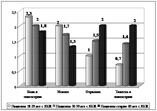 Пациенты с ЯБ старше 60 лет были разделены на группы согласно срокам развития заболевания – впервые возникло до 60 лет и сохранило периодичность чередования обострений и ремиссии (группа А) и возникло после 60 лет («поздняя» ЯБ, группа В). Клиническая картина обострения ЯБ у пожилых, в отличие от пациентов 18-59 лет, характеризуется слабо выраженным болевым синдромом и преимущественно проявлениями язвенной диспепсии (рис.1-2).